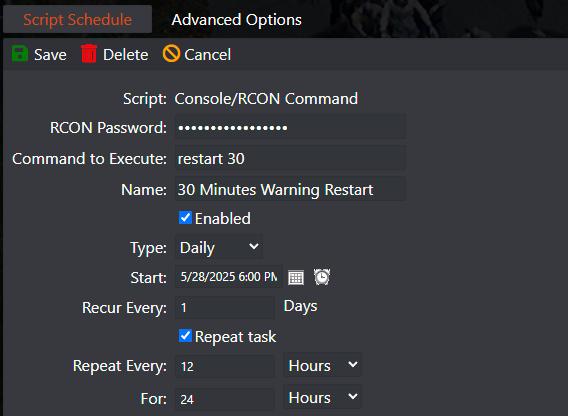 For this guide, we are going to set up a scheduled task to restart the server every 12 hours with 30 minutes warning; you can adjust the restart cycle and also the message warning timer.